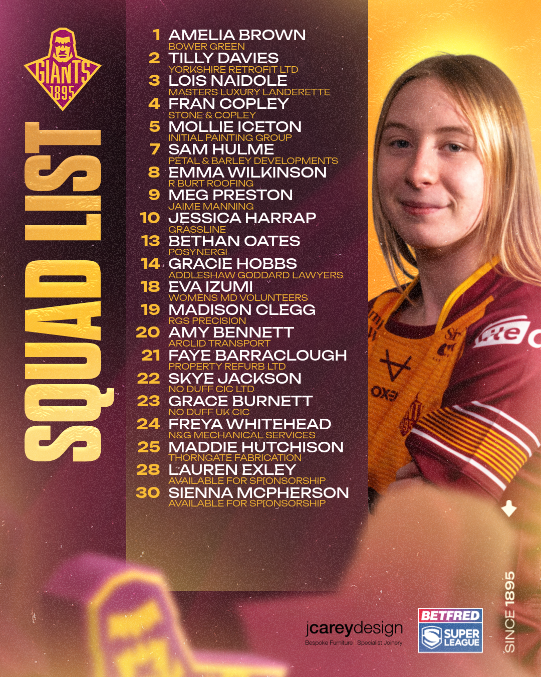 Madison Clegg has been named in the U19's squad for the first time and is set to feature on Saturday, when the Giants Women take on Leigh Leopards at Golbourne Parkside, 12:00pm kick-off.